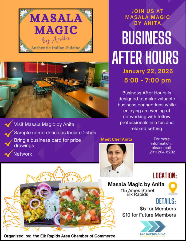 If you are interested in hosting a Business After Hours event, please contact the Elk Rapids Area Chamber of Commerce at 231-264-8202 or email laura@elkrapidschamber.org.