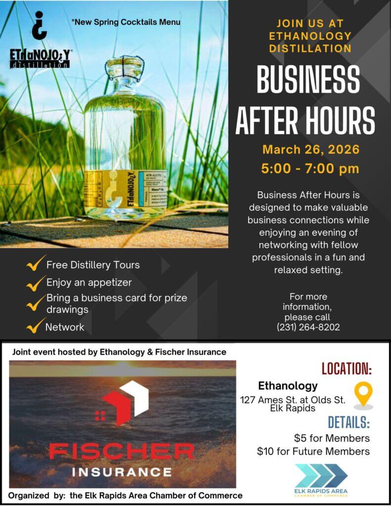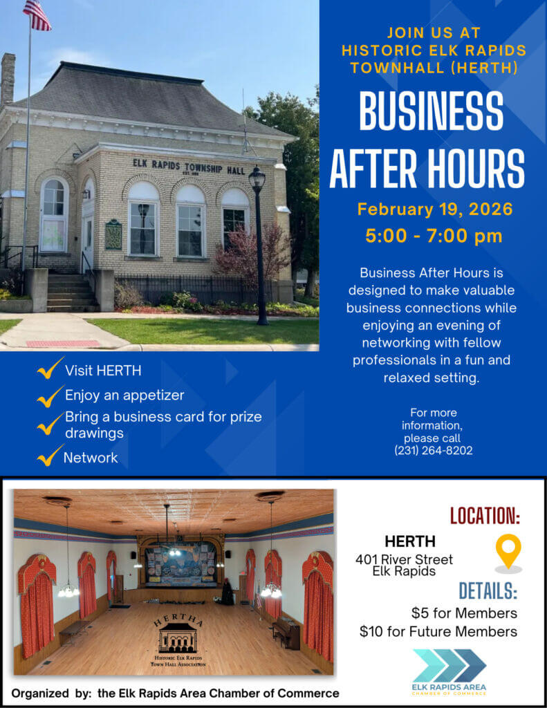 If you are interested in hosting a Business After Hours event, please contact the Elk Rapids Area Chamber of Commerce at 231-264-8202 or email laura@elkrapidschamber.org.